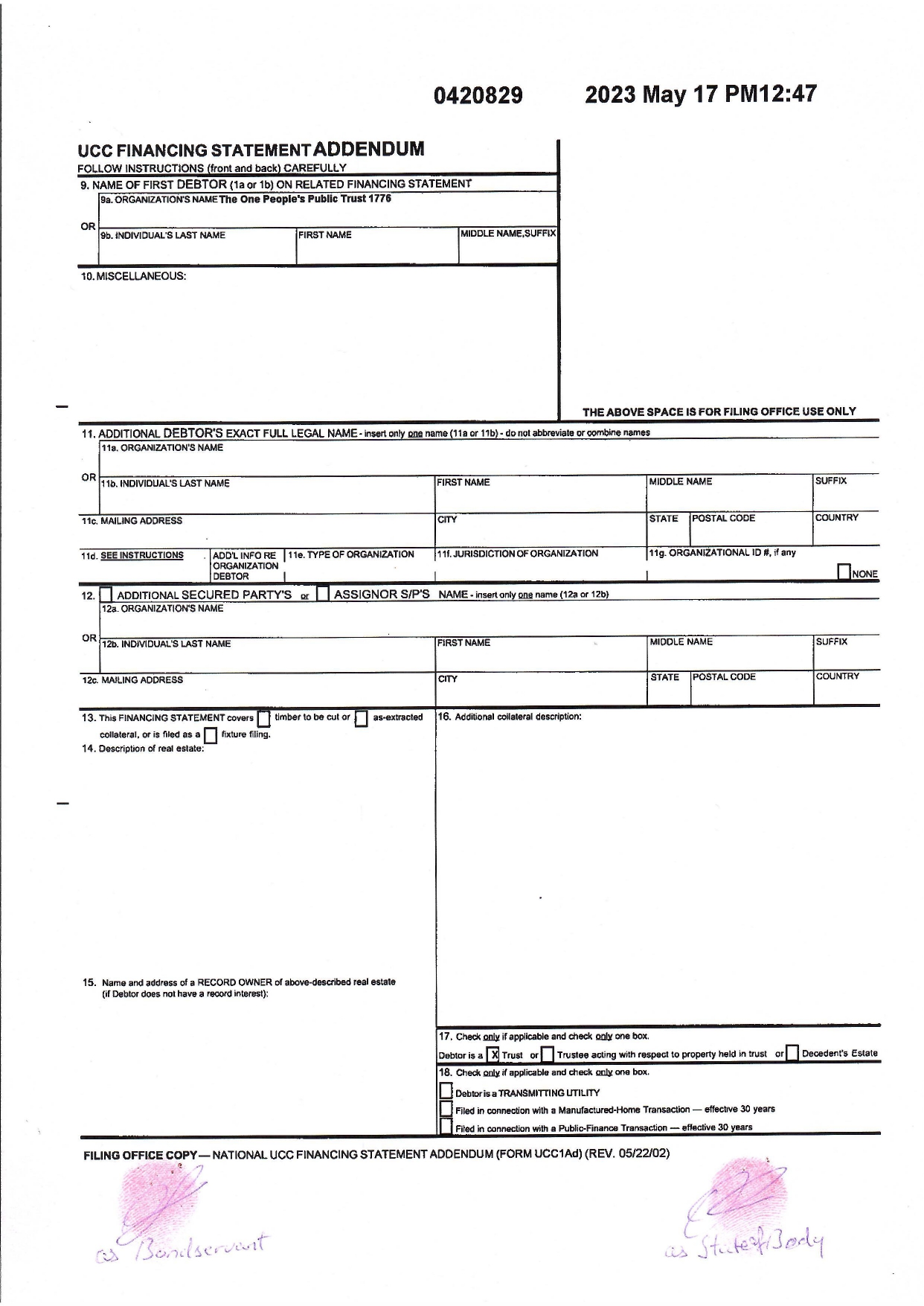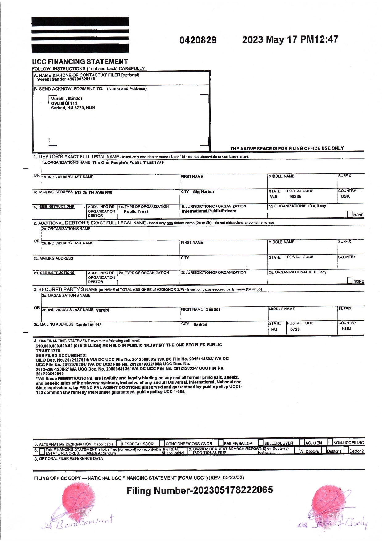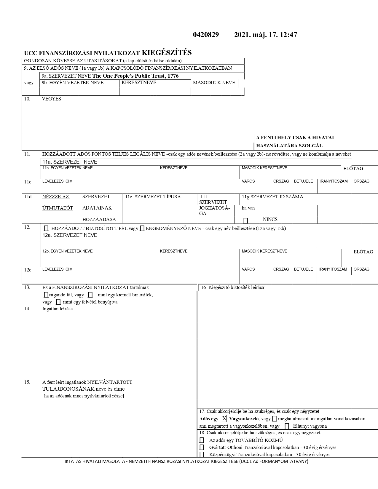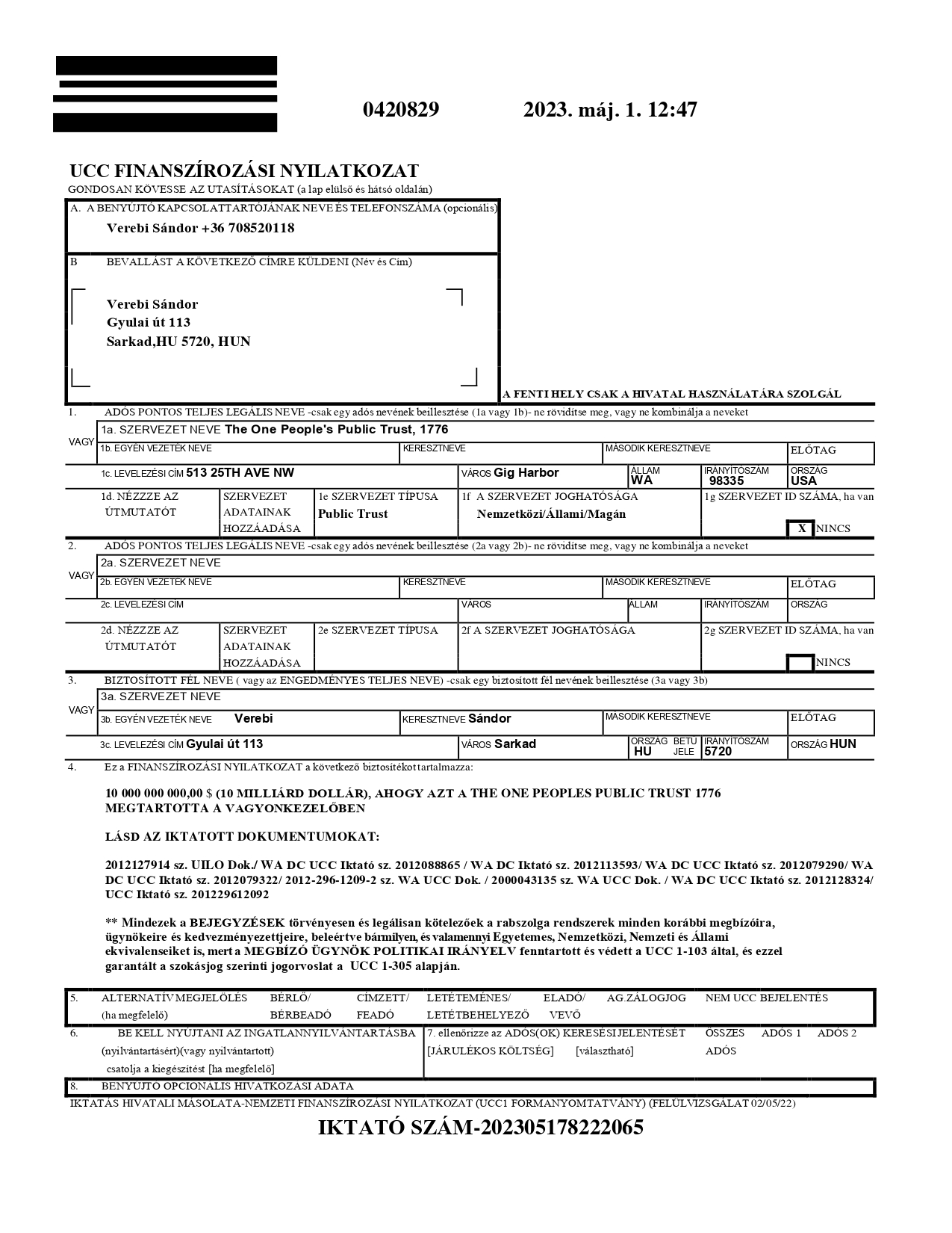 A UCC, beleértve bármilyen és valamennyi **állami, **nemzeti, **nemzetközi és **egységes ekvivalensét is, jogszerűen BEJEGYZETT kizárólagos és megsemmisíthetetlen jogcímmel, tulajdonjoggal, és jogokkal, mely jogszerűen biztosított a bolygón élő összes embernek, egyformán, Egységesen, UCC nyilvántartási számai 2000043135 (az eredeti nyilvántartott ”perpetuity”), 2011055259, 2011051841, 2011055260, 2011125781 (az engedményezéssel BEJEGYZETT ajándék), 2012012675 és 2012025545 (az ajándék elfogadásának BEJEGYZÉSE).
