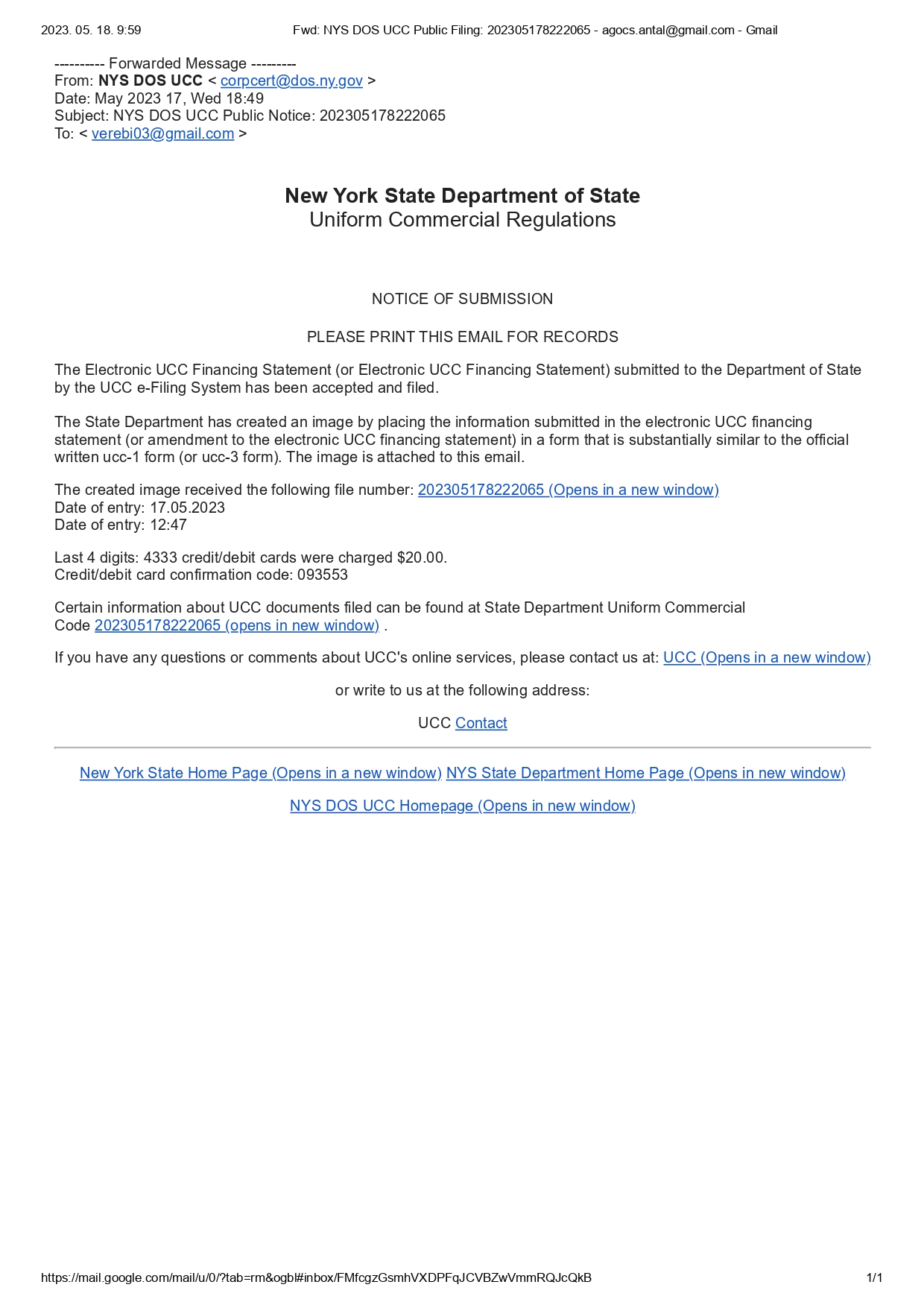 Ezen a weboldalon közzétett UCC Dokumentumok - UCC Financing Statement-ek (Finanszírozási Nyilatkozatok), és adott eset(ek)ben UCC Financing Statement Amendment(-ek) (Finanszírozási Nyilatkozat Módosítások) - az Amerikai Egyesült Államokban (USA), New York Állam Egységes Kereskedelmi Kódex (Uniform Commercial Code - rövidítve UCC), kereskedelmi nyilvántartásában nyilvántartottak.