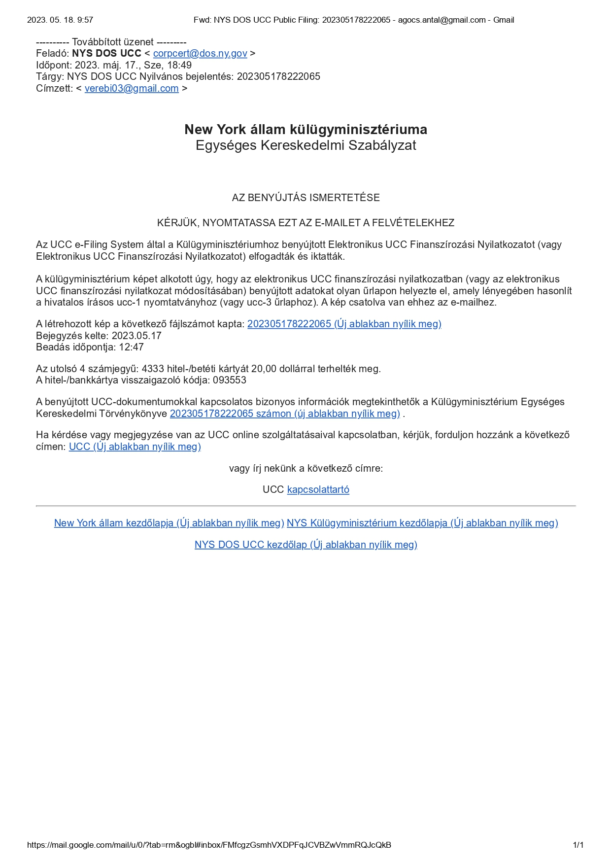 Hogyan lehet ellenőrizni, hogy az alábbi UCC Financing Statement (Finanszírozási Nyilatkozat), és adott esetben UCC Financing Statement Amendment-ek (Finanszírozási Nyilatkozat Módosítások) szerepelnek-e a UCC nyilvántartásában? Menjen az alábbi weboldalra: